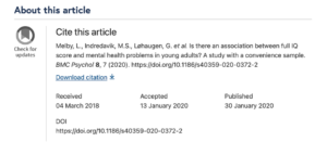 Melby, L., Indredavik, M. S., Løhaugen, G., Brubakk, A. M., Skranes, J., & Vik, T. (2020). Is there an association between full IQ score and mental health problems in young adults? A study with a convenience sample. BMC Psychology, 8(1). https://doi.org/10.1186/s40359-020-0372-2